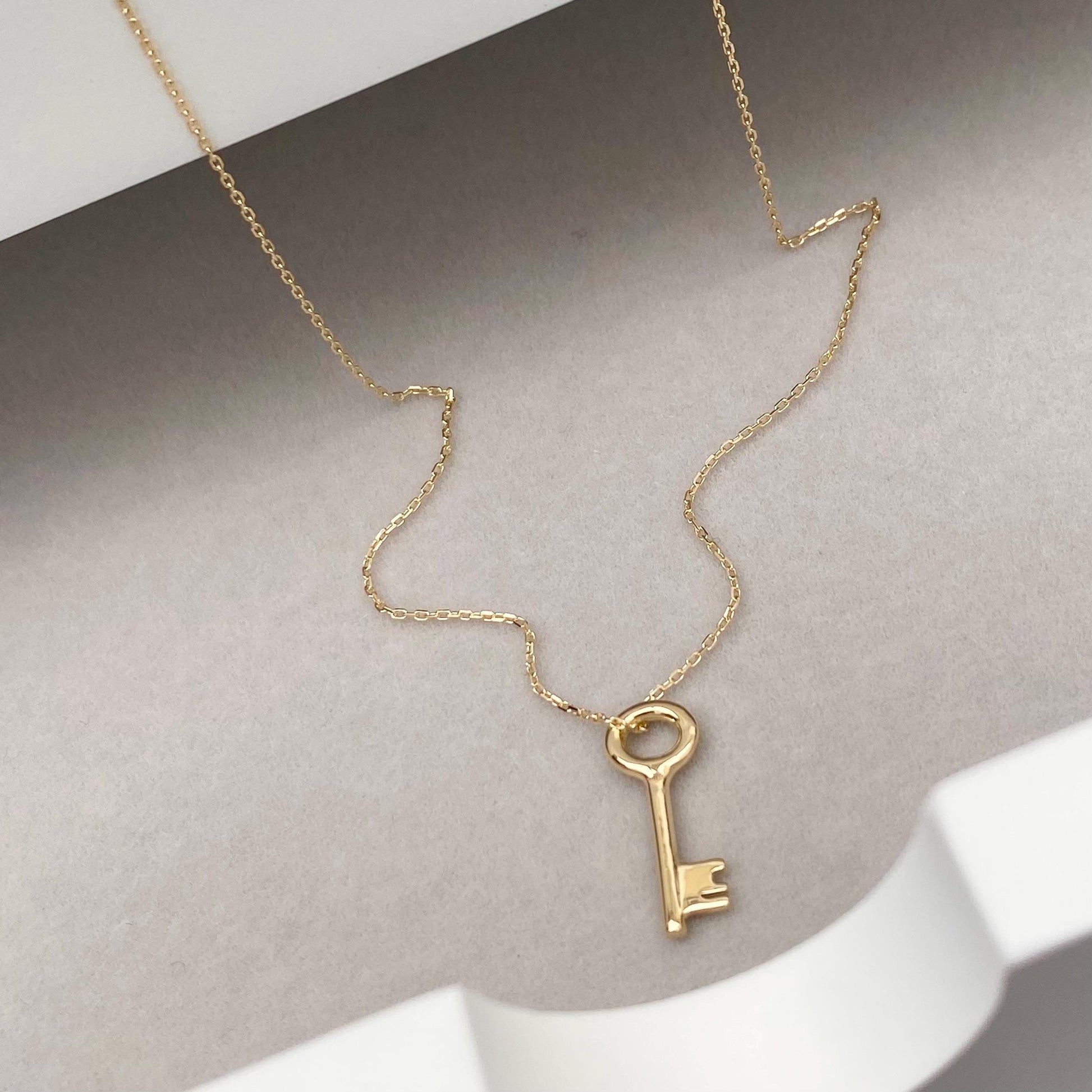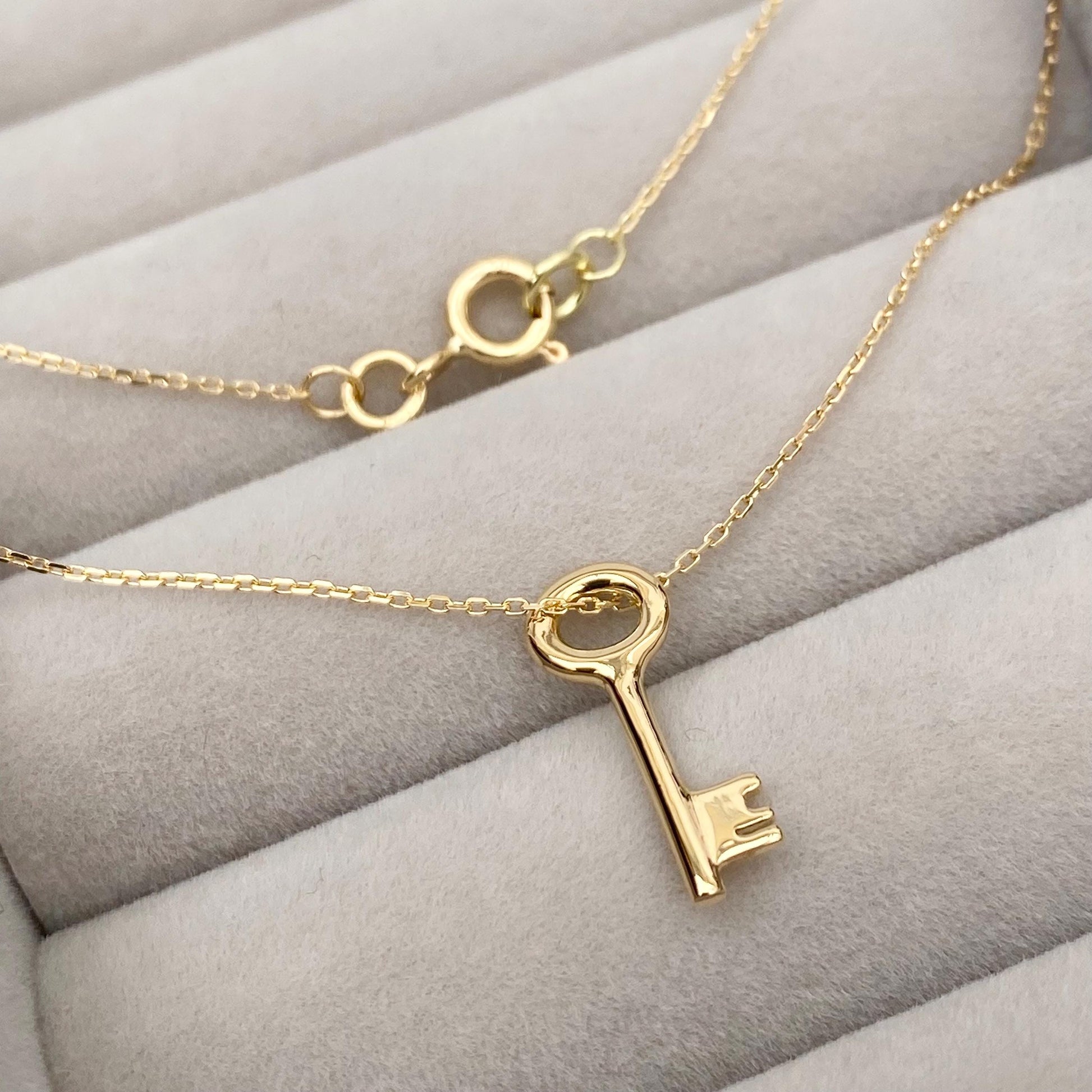 18ct solid yellow gold small and dainty key charm pendant and chain