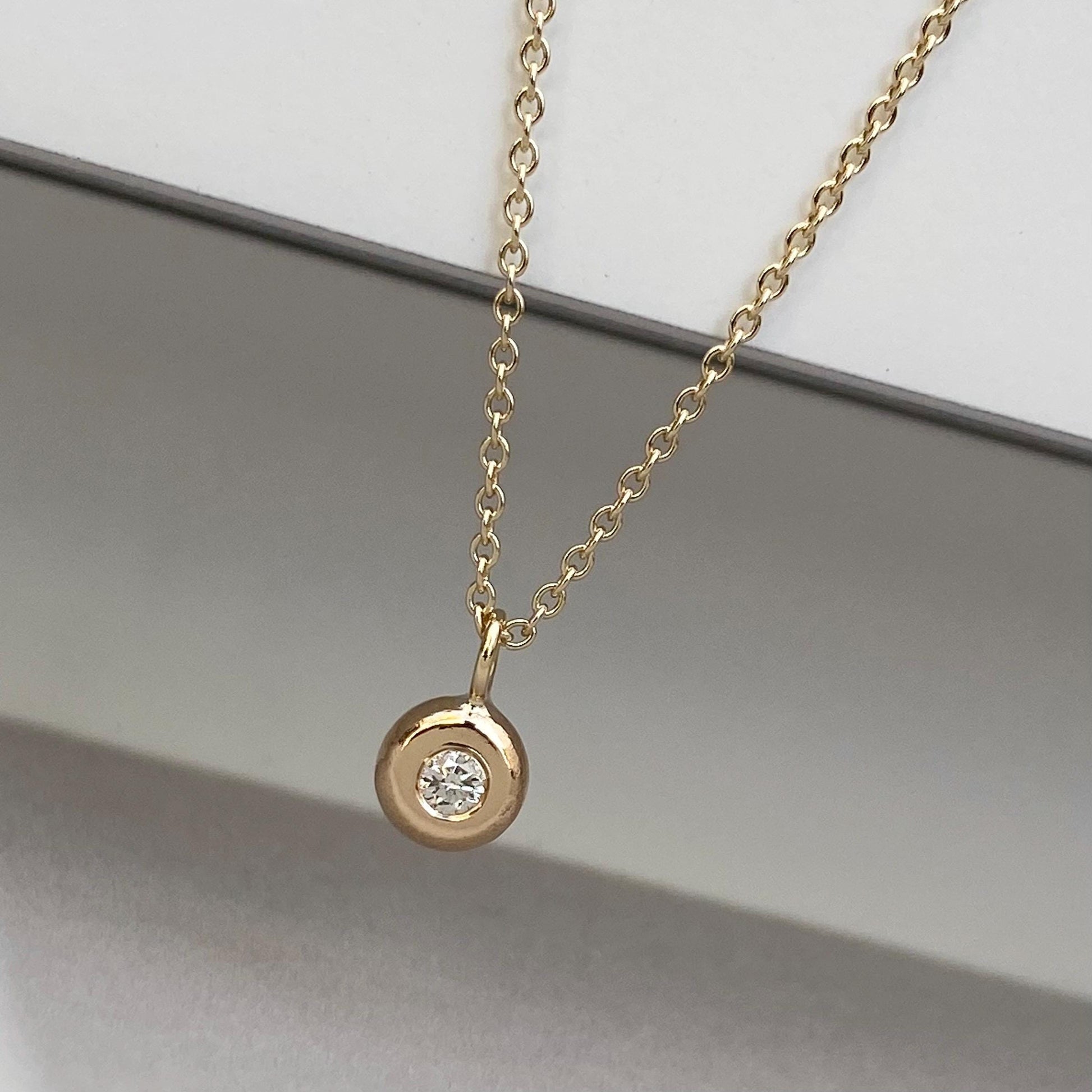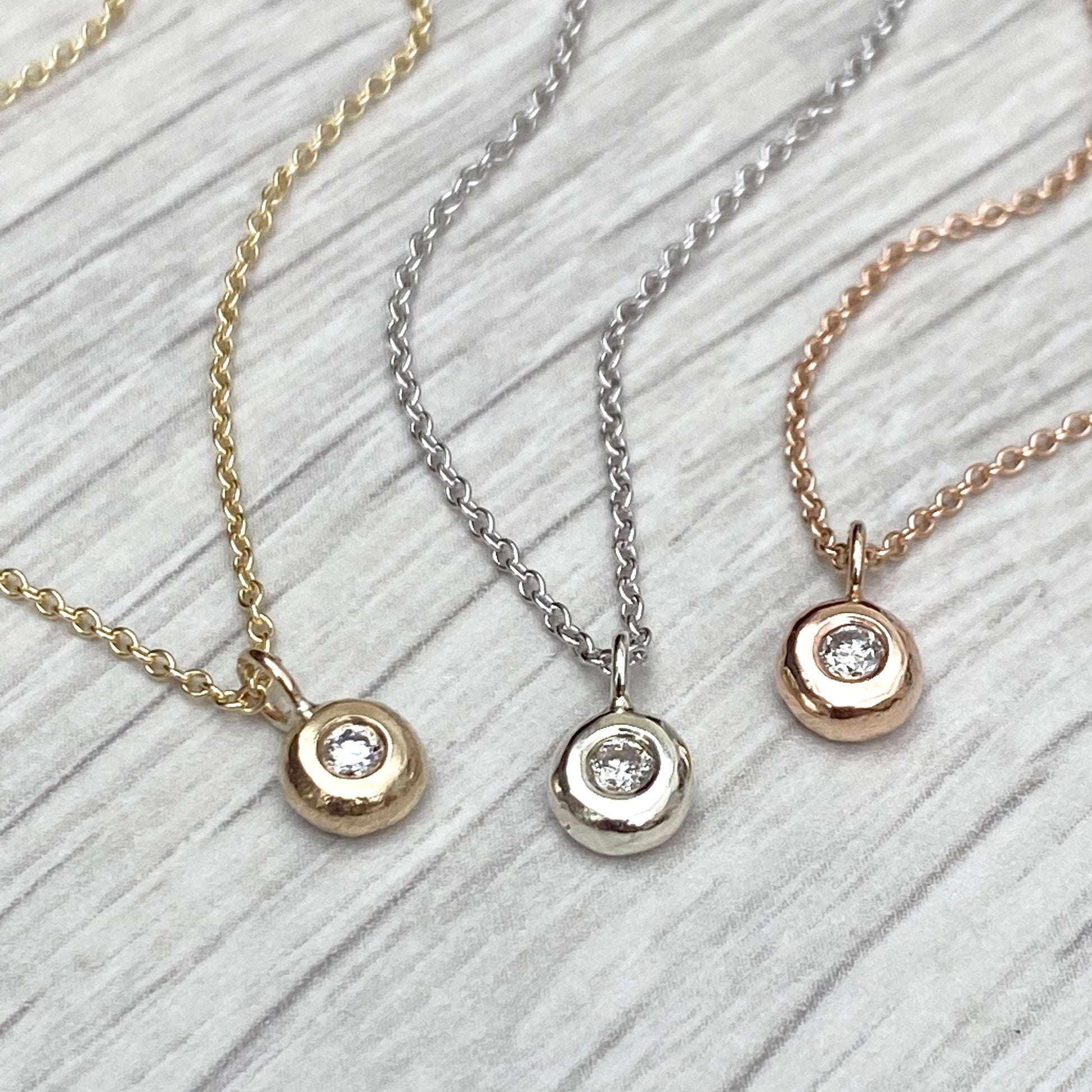 Handmade 9ct solid yellow, white or rose gold 2.5mm natural round diamond pendant on a 1.2mm trace chain