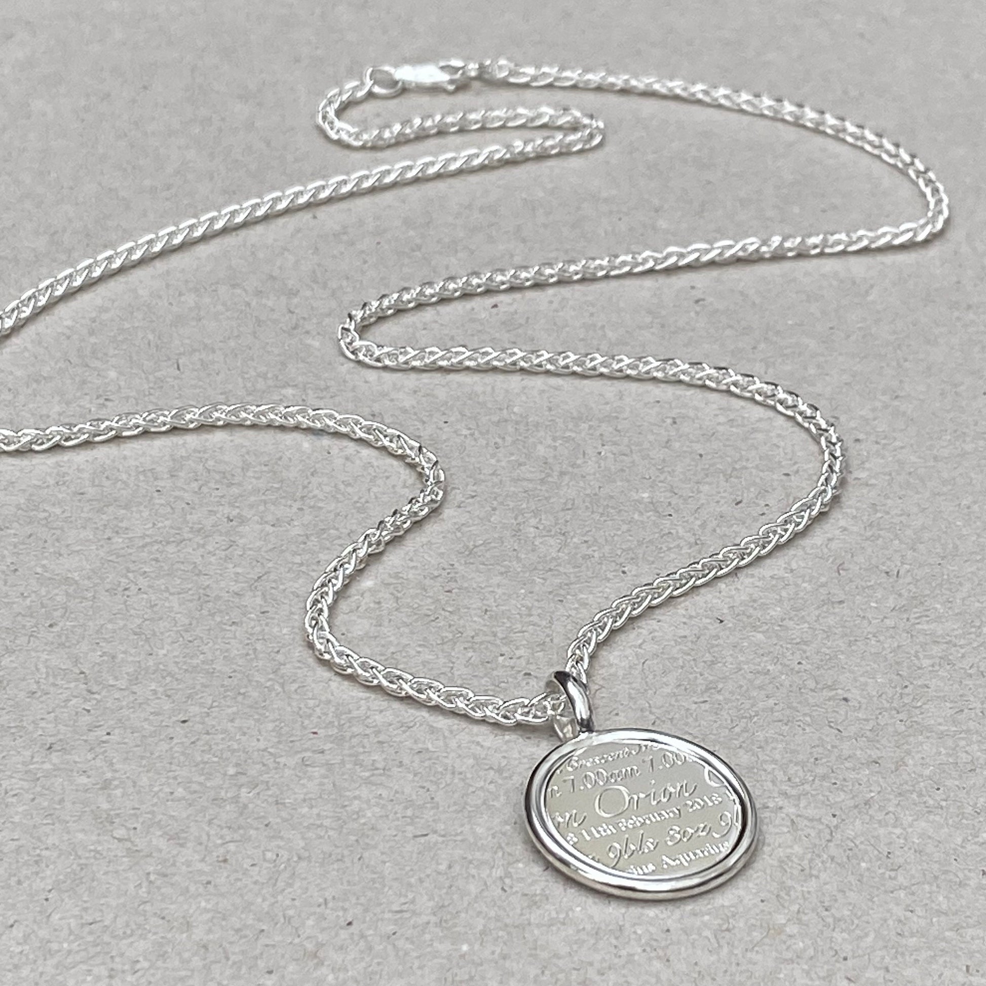 Handmade oxidised or polished solid silver round framed birth story pendant on a 2.5mm wide spiga chain - Mens jewellery