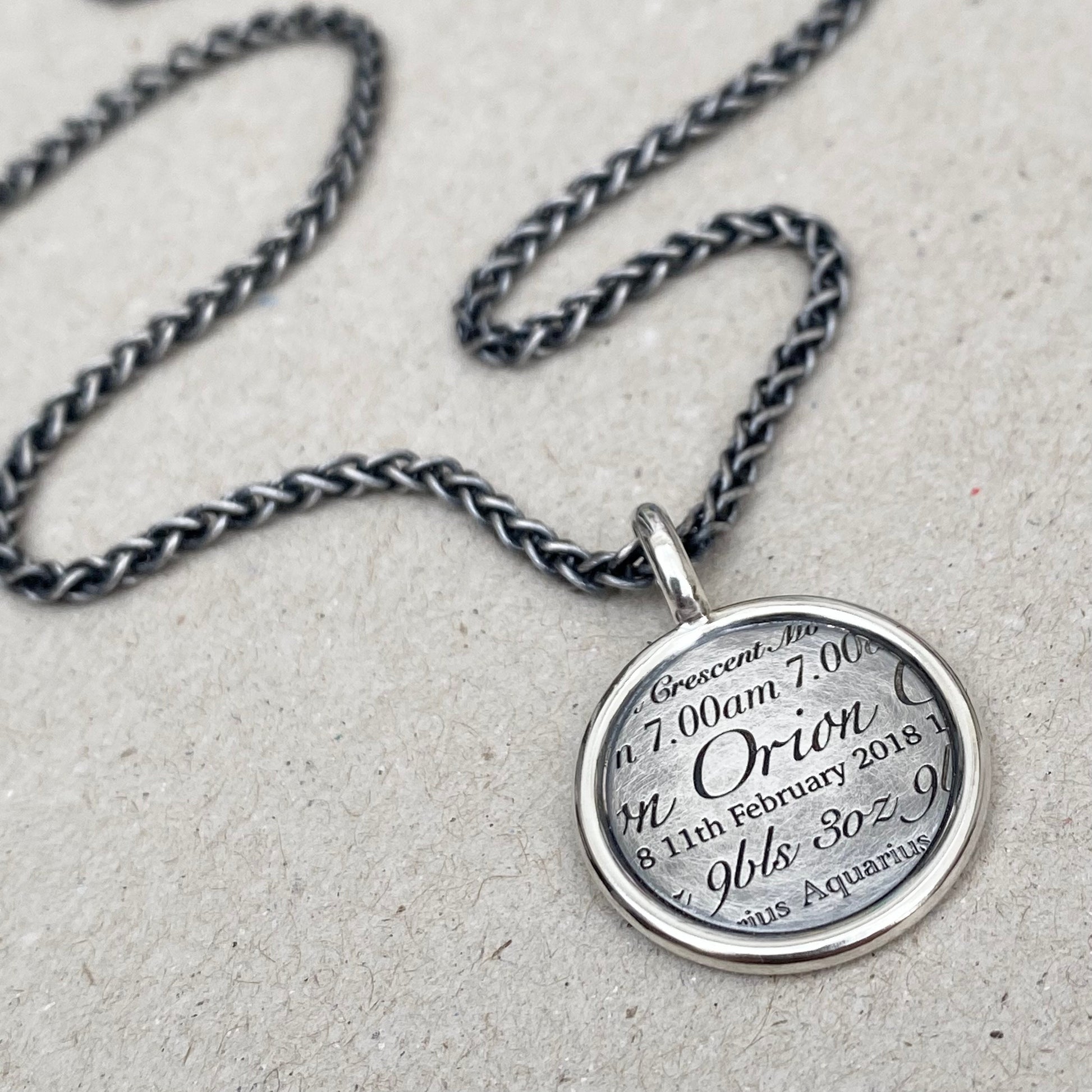 Handmade oxidised or polished solid silver round framed birth story pendant on a spiga chain - Mens jewellery