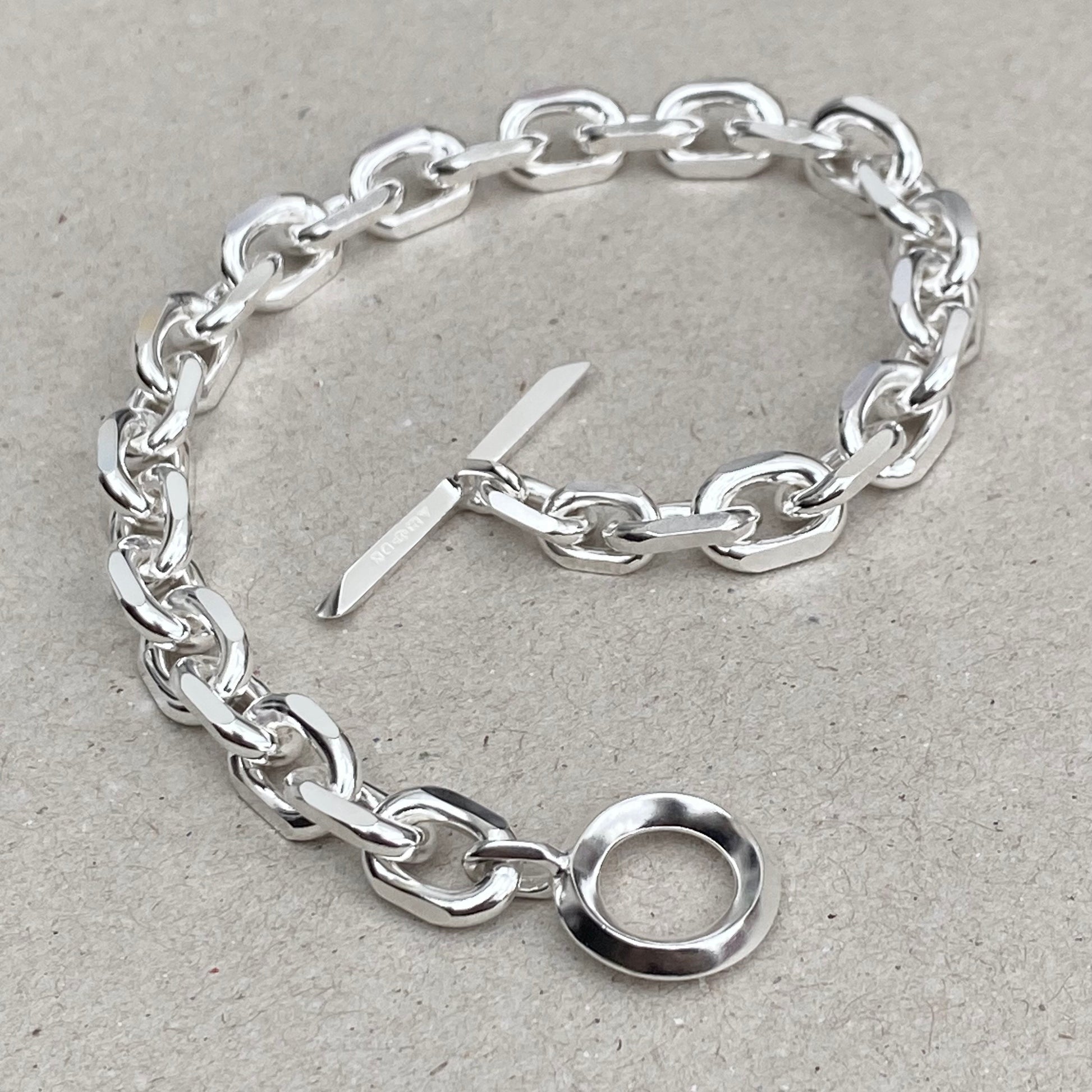 Oxidised or polished solid silver 8.5mm wide diamond cut trace chain bracelet with a unique T-bar design