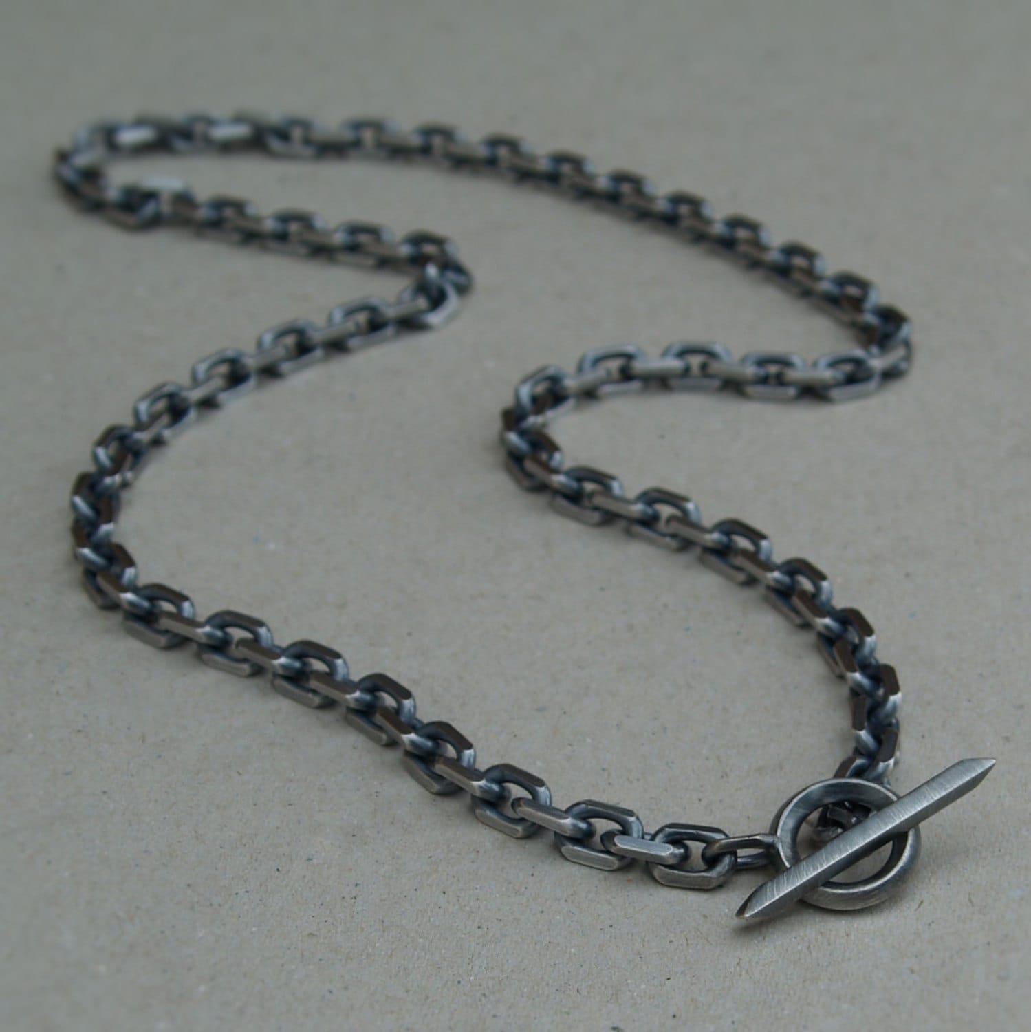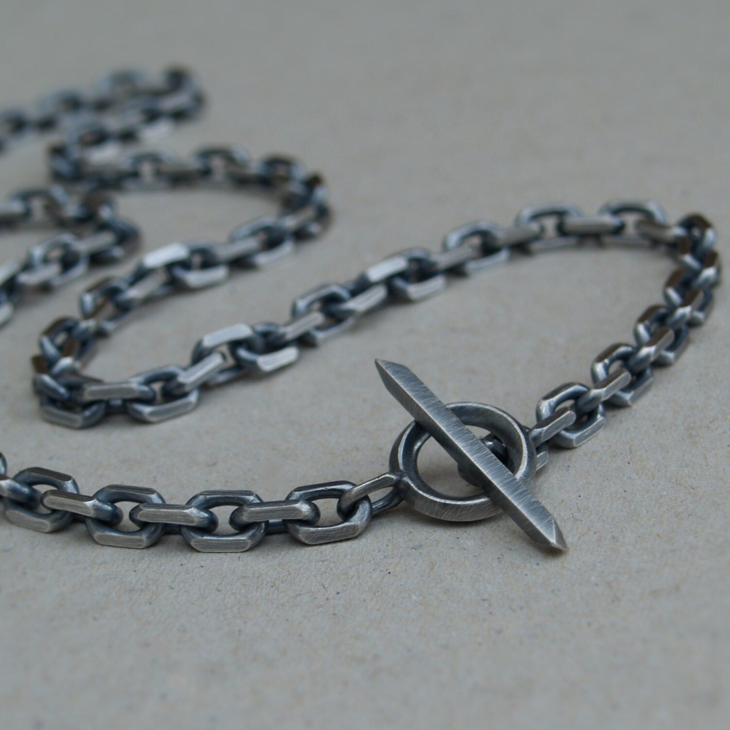 Oxidised or polished solid silver extra heavy 6.6mm wide diamond cut trace chain with a unique T-bar design.