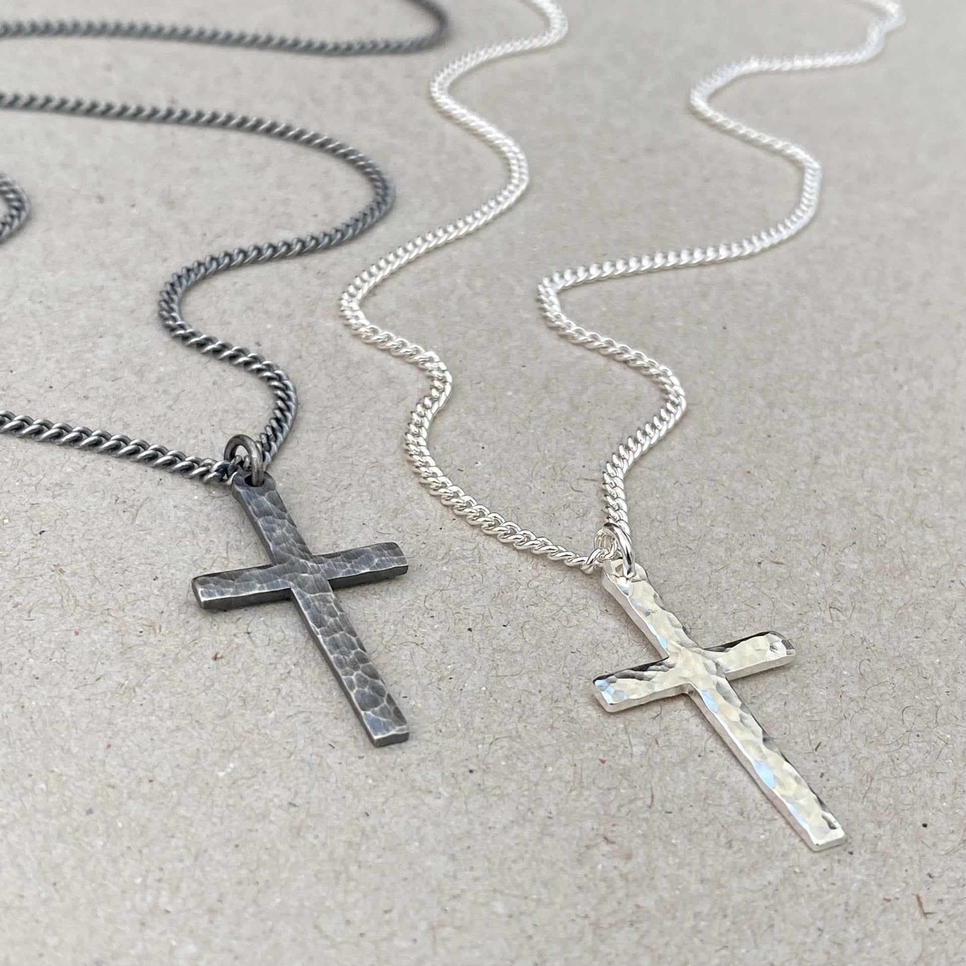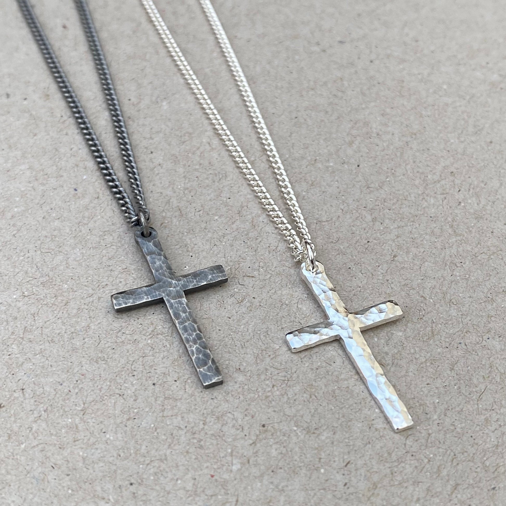 Solid silver standard size hammered cross pendant and on a 2.1mm wide tight curb chain - Oxidised or polished