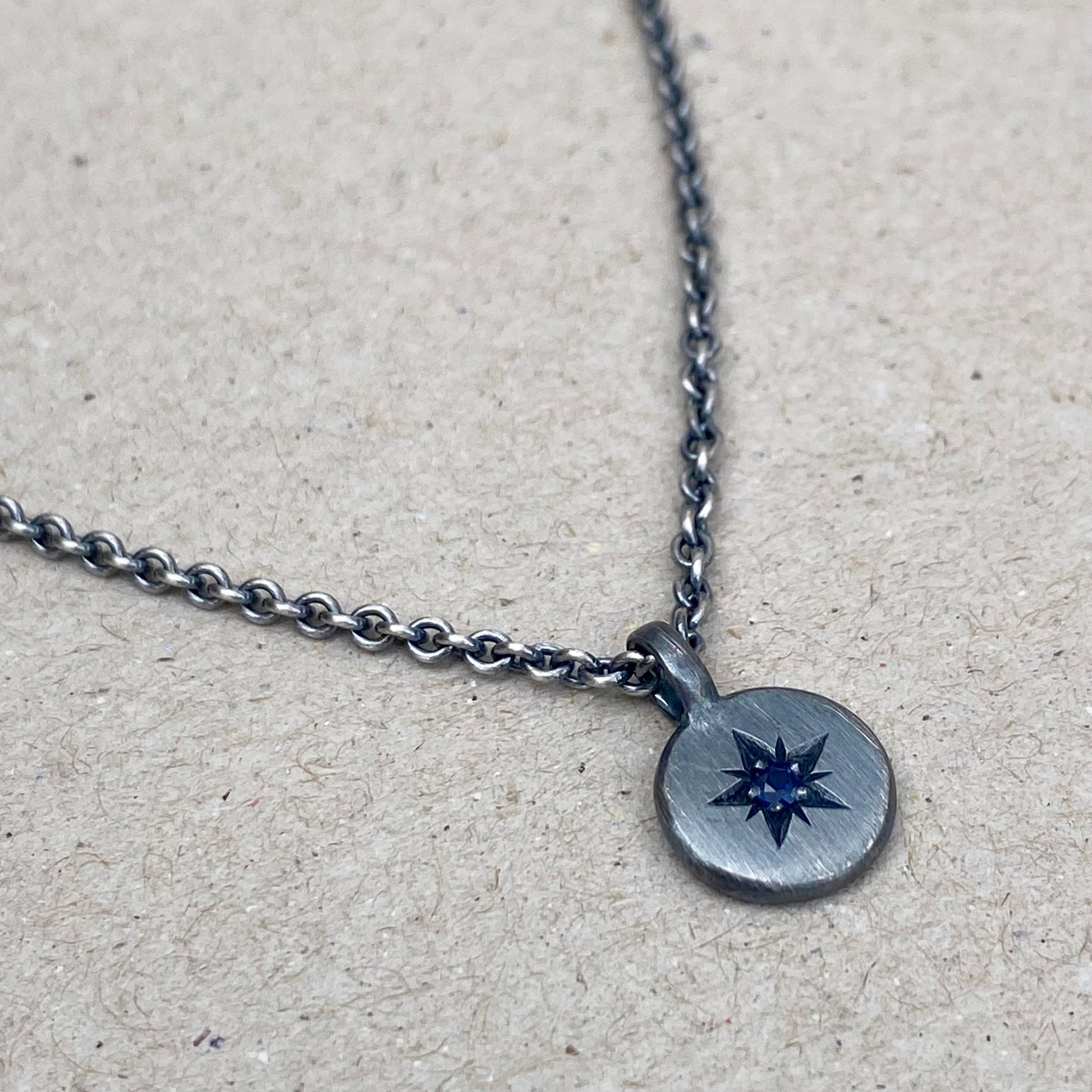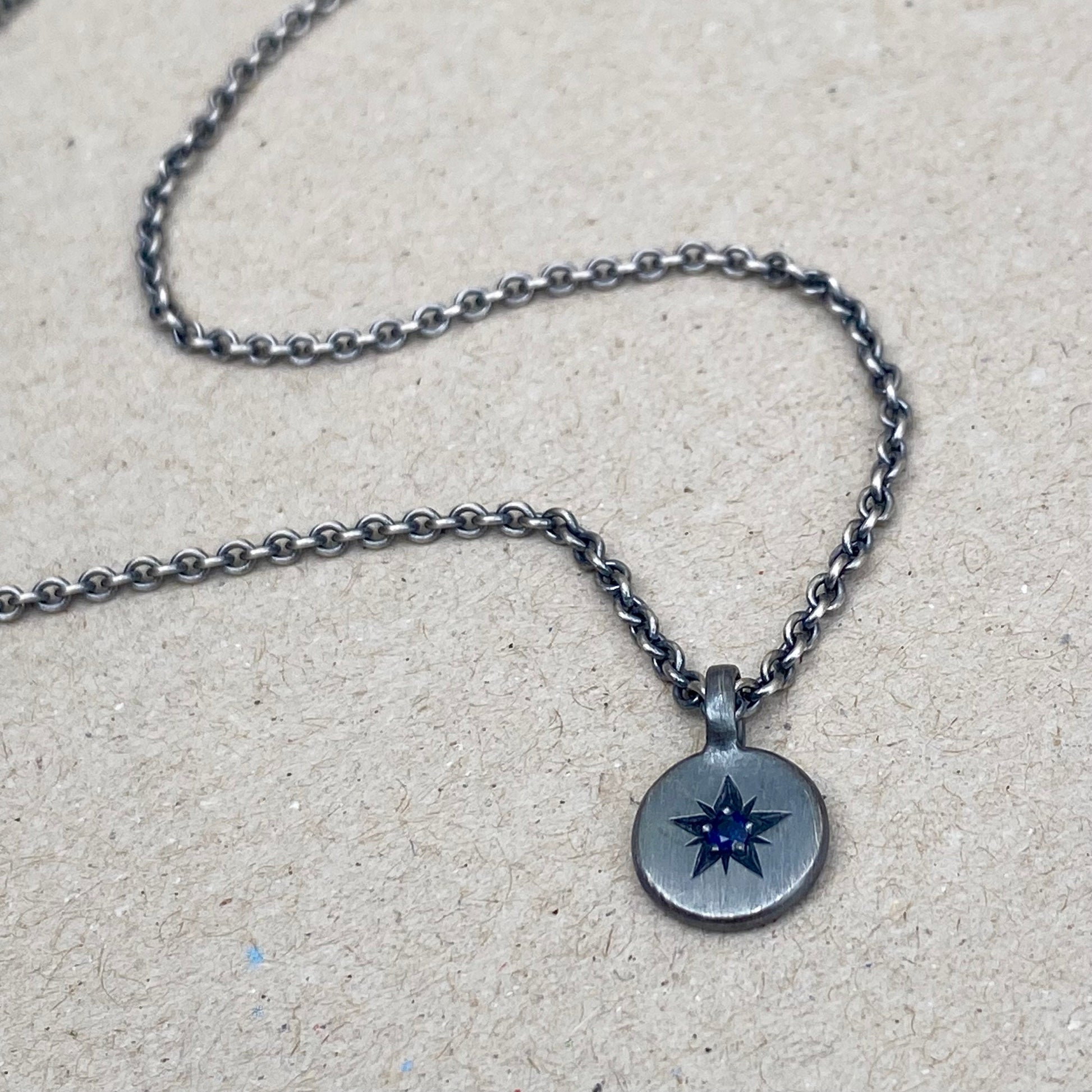 Oxidised silver star engraved birthstone 10mm pendant on a tight trace chain