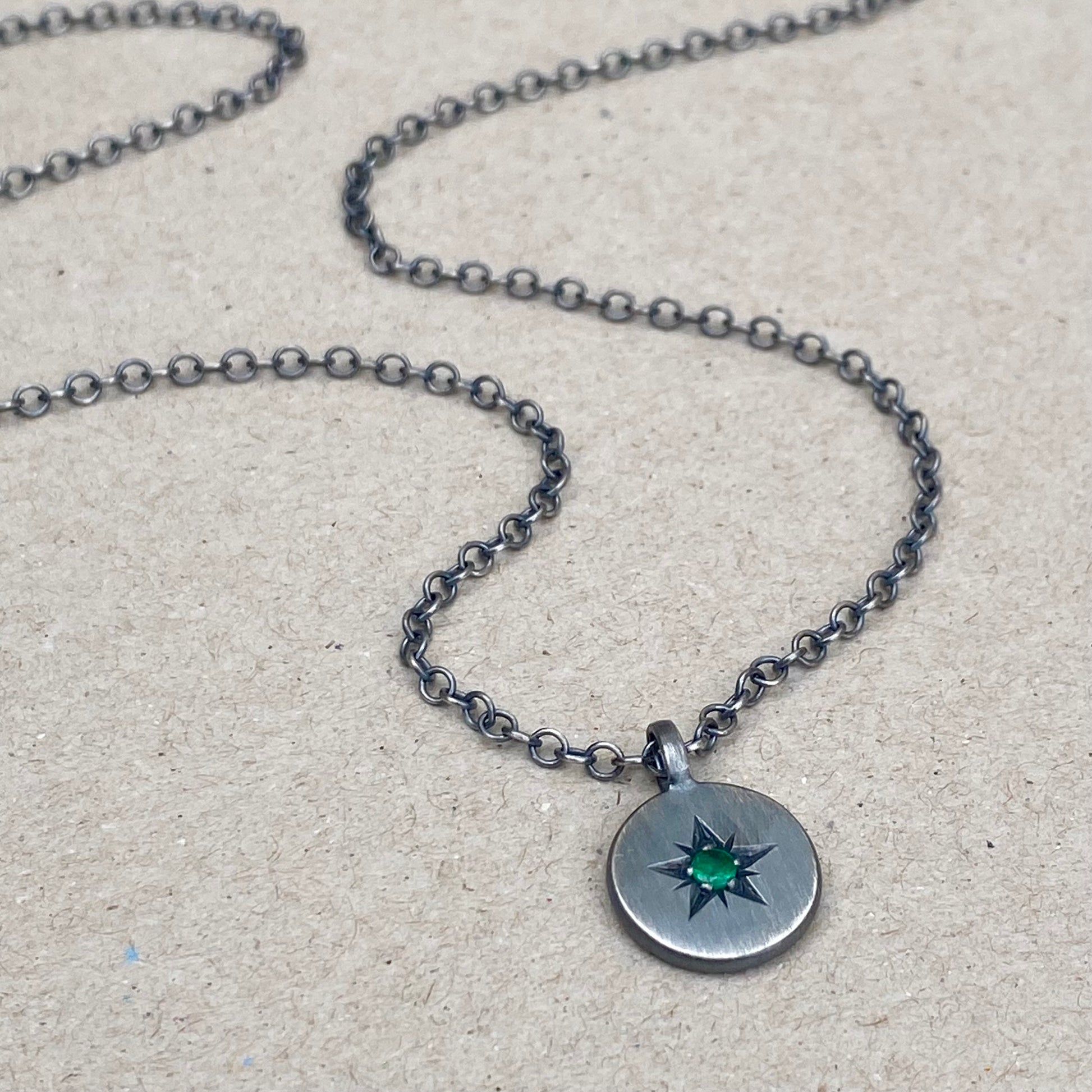 Oxidised silver star engraved birthstone 13mm pendant on a trace chain