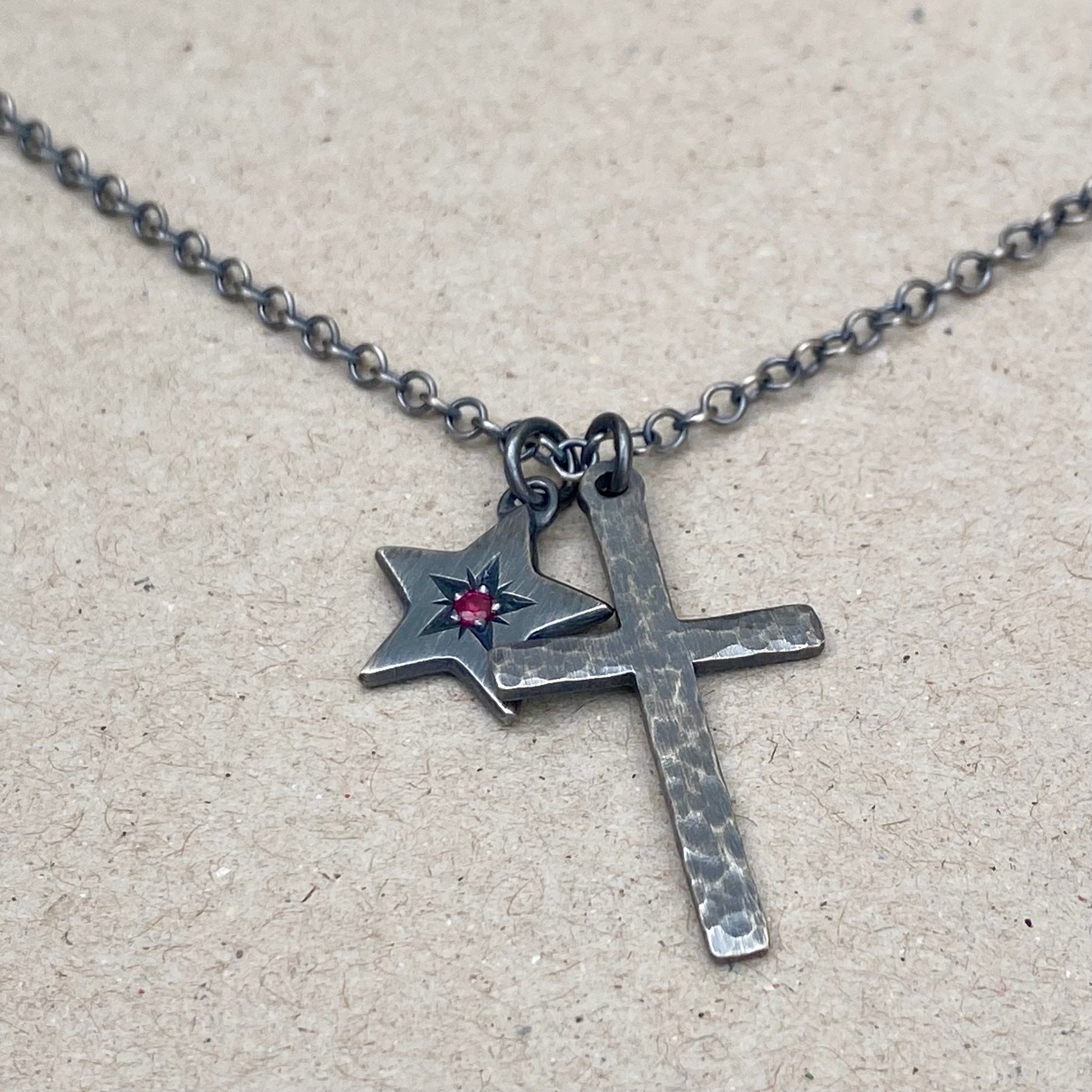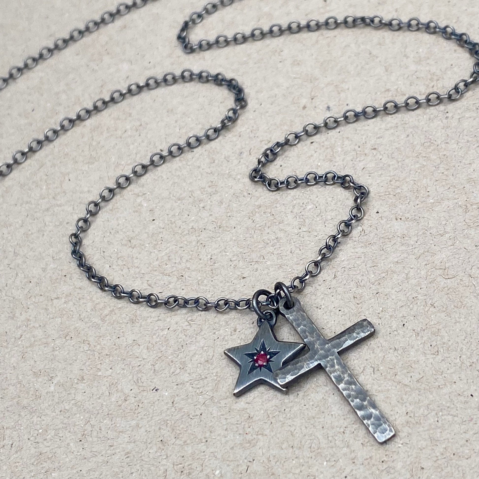 Oxidised silver star engraved birthstone star pendant and hammered cross on a trace chain