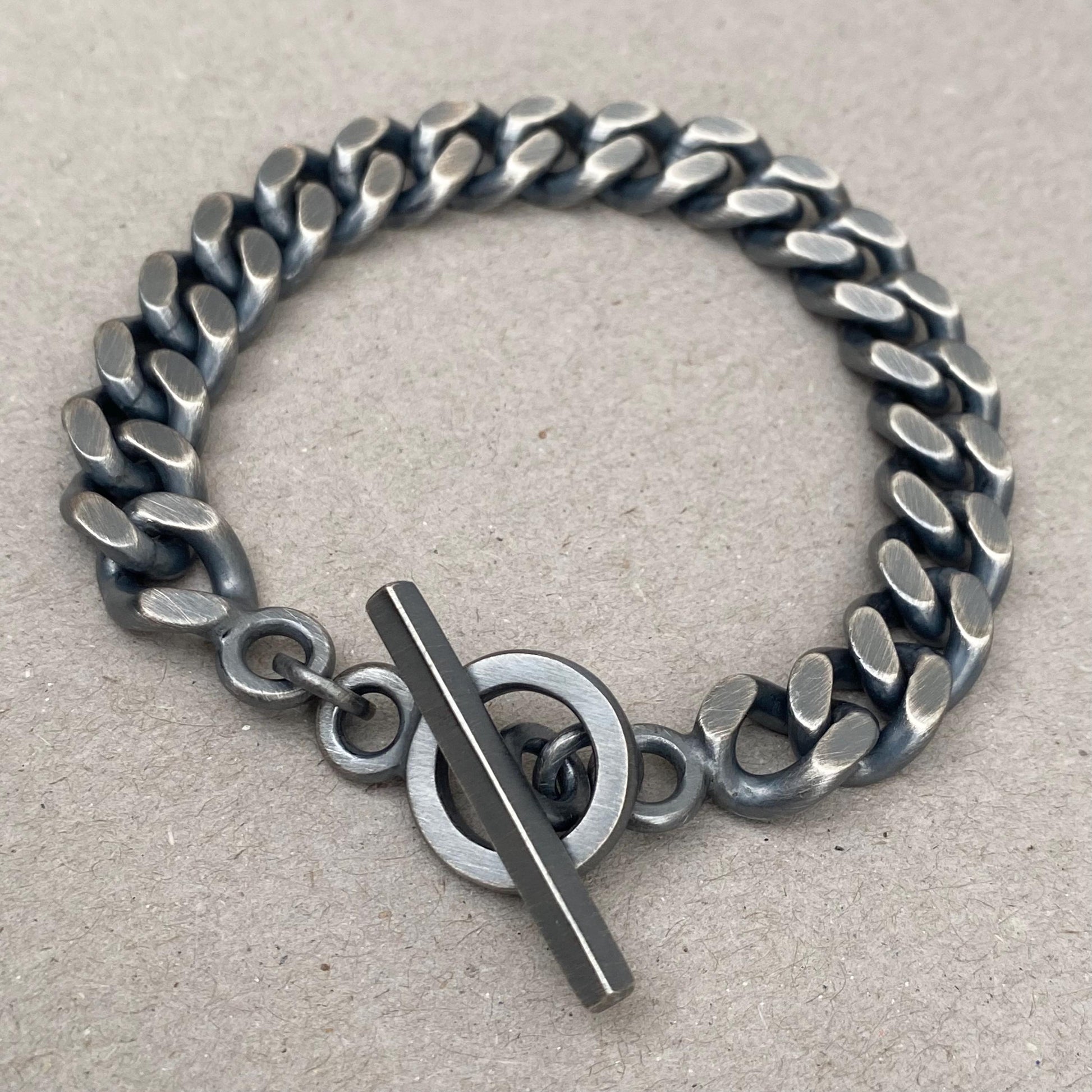 Oxidised solid silver 10.4mm wide heavy filed curb chain bracelet with a handmade T-bar