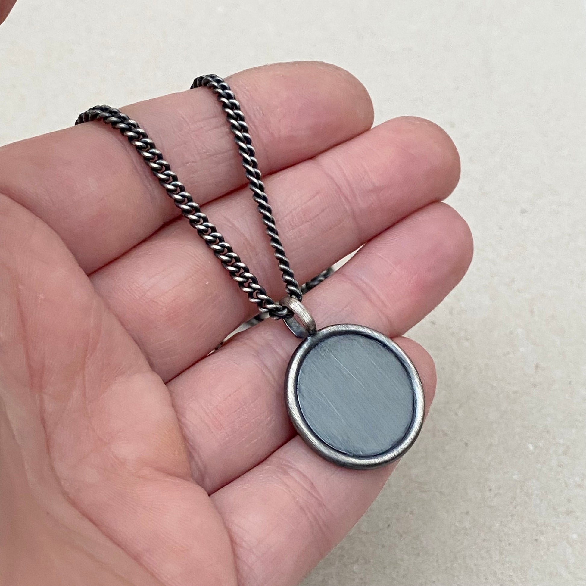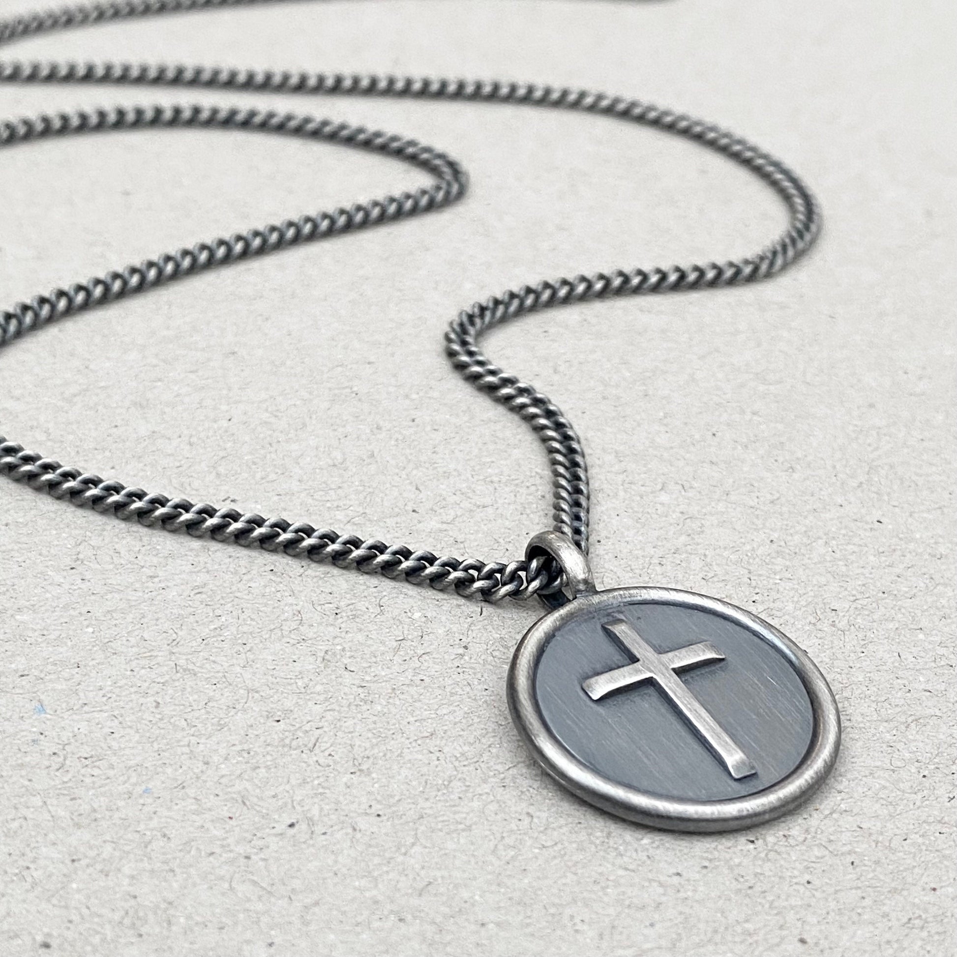 Oxidised solid silver framed circle cross pendant on a curb chain