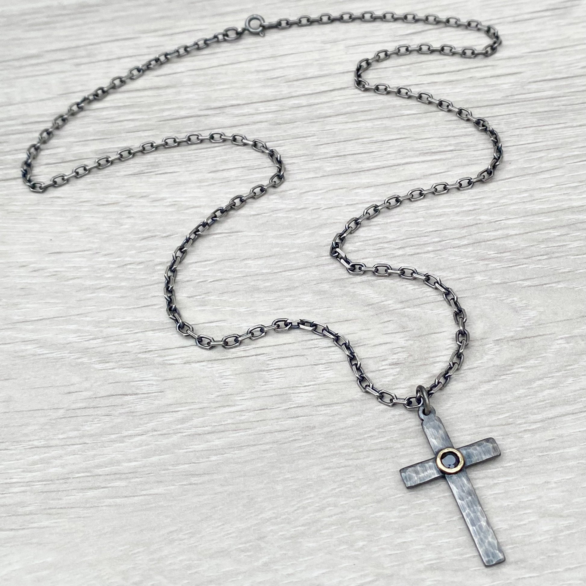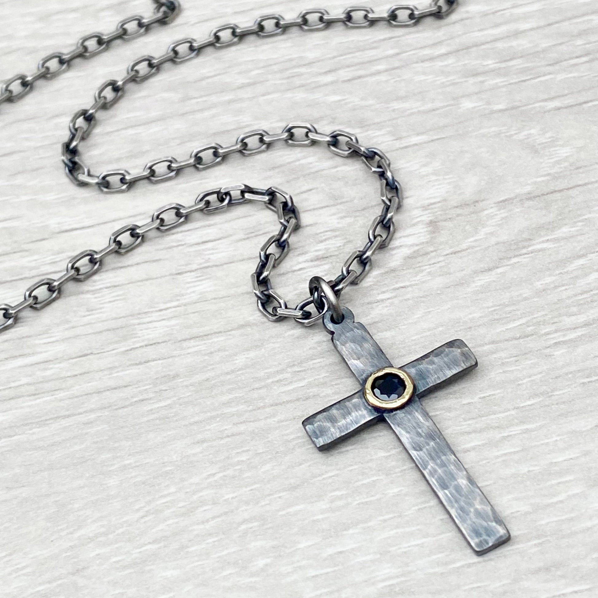 Oxidised solid sterling silver hammered medium size cross with a 9ct yellow gold set black sapphire on a diamond cut trace chain