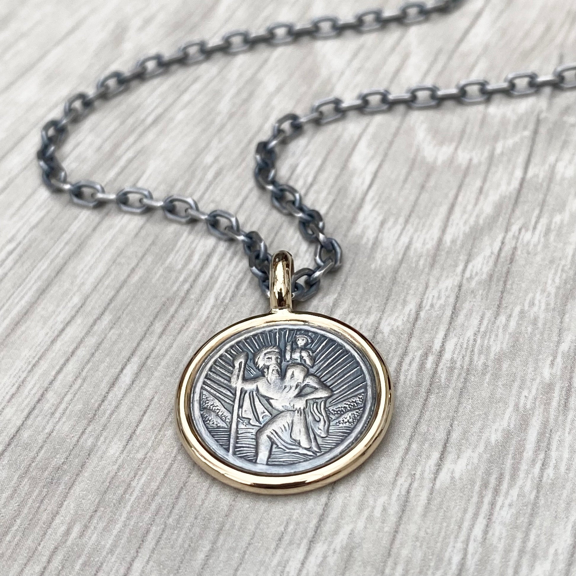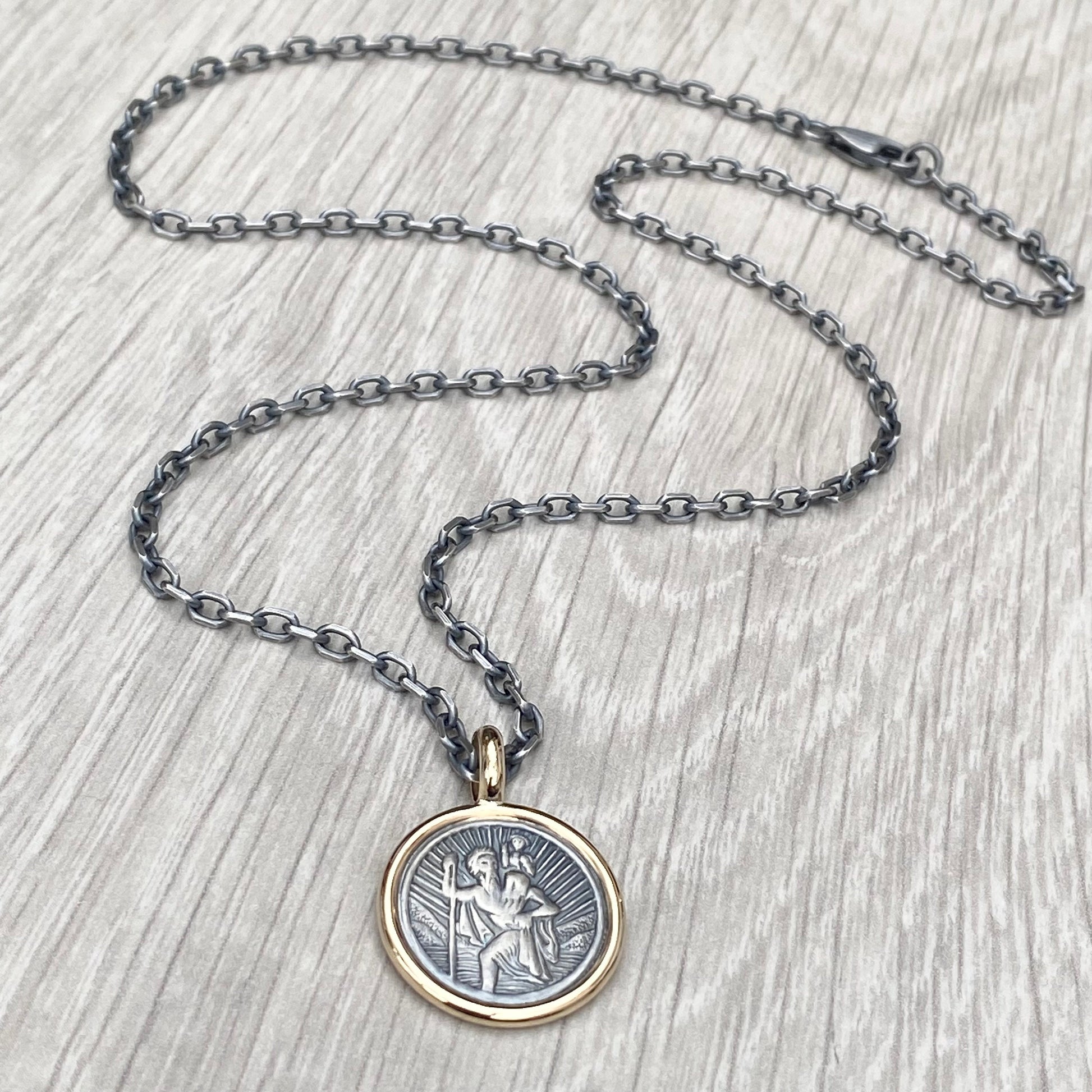 Oxidised solid silver round Saint Christopher 9ct yellow gold framed pendant on diamond cut trace chain