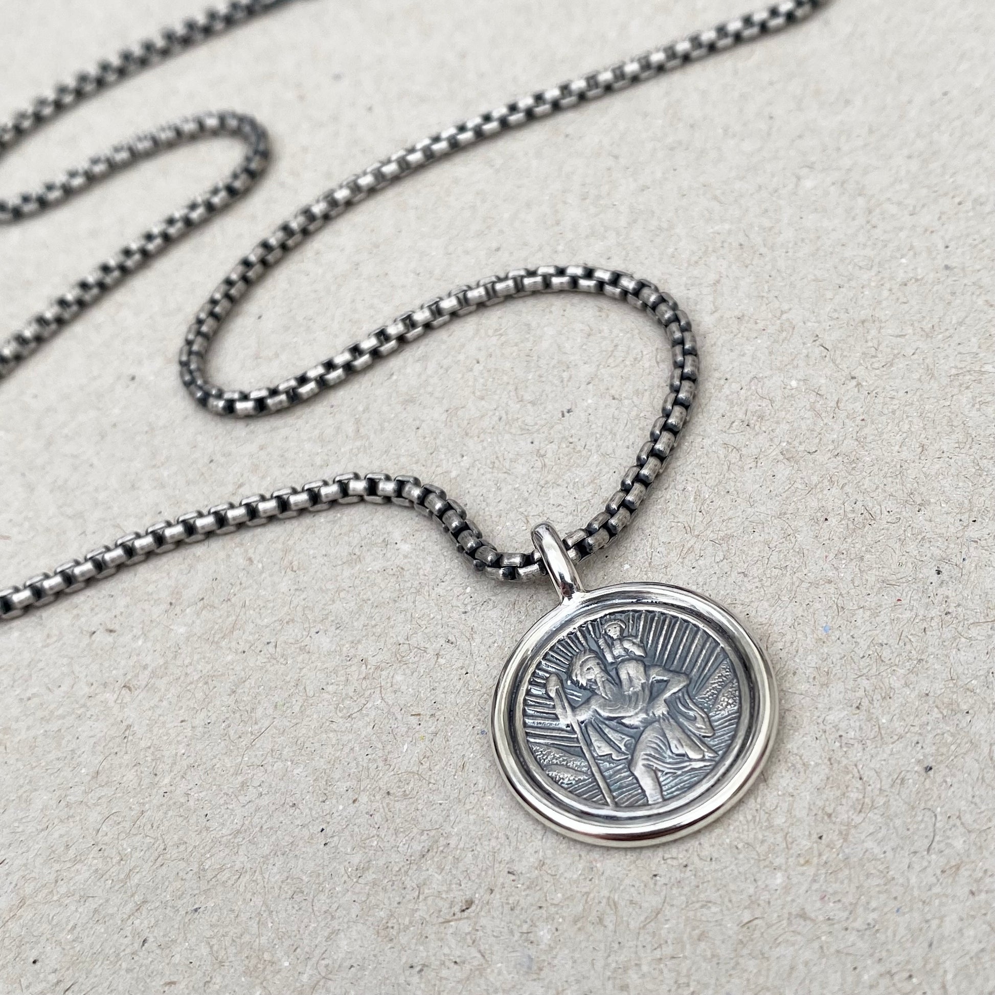 Oxidised solid silver Saint Christopher framed circle pendant on a 2.5mm wide round box belcher chain.