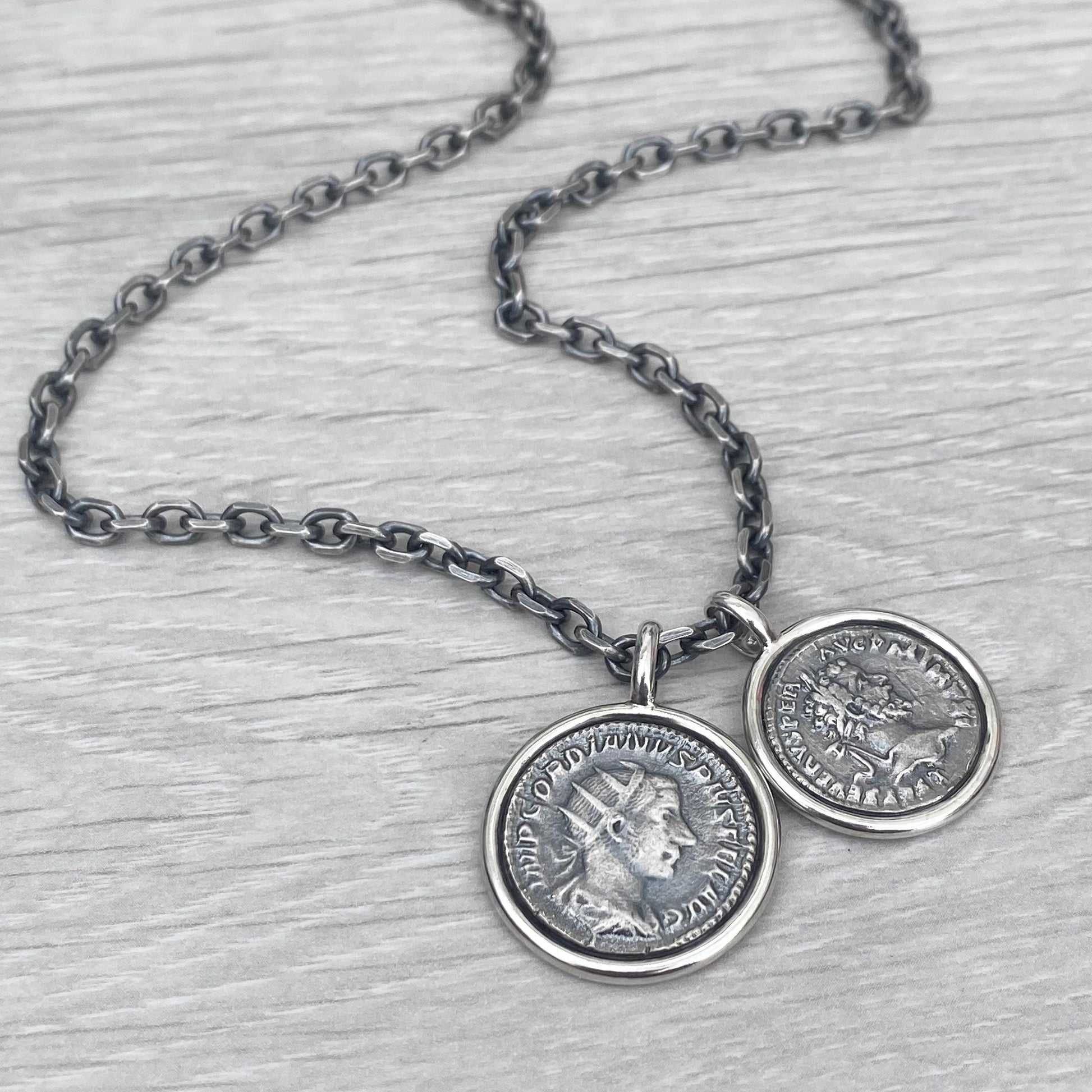 Oxidised solid Sterling silver replica Roman coin circle framed pendants on a choice of spiga or round box chain
