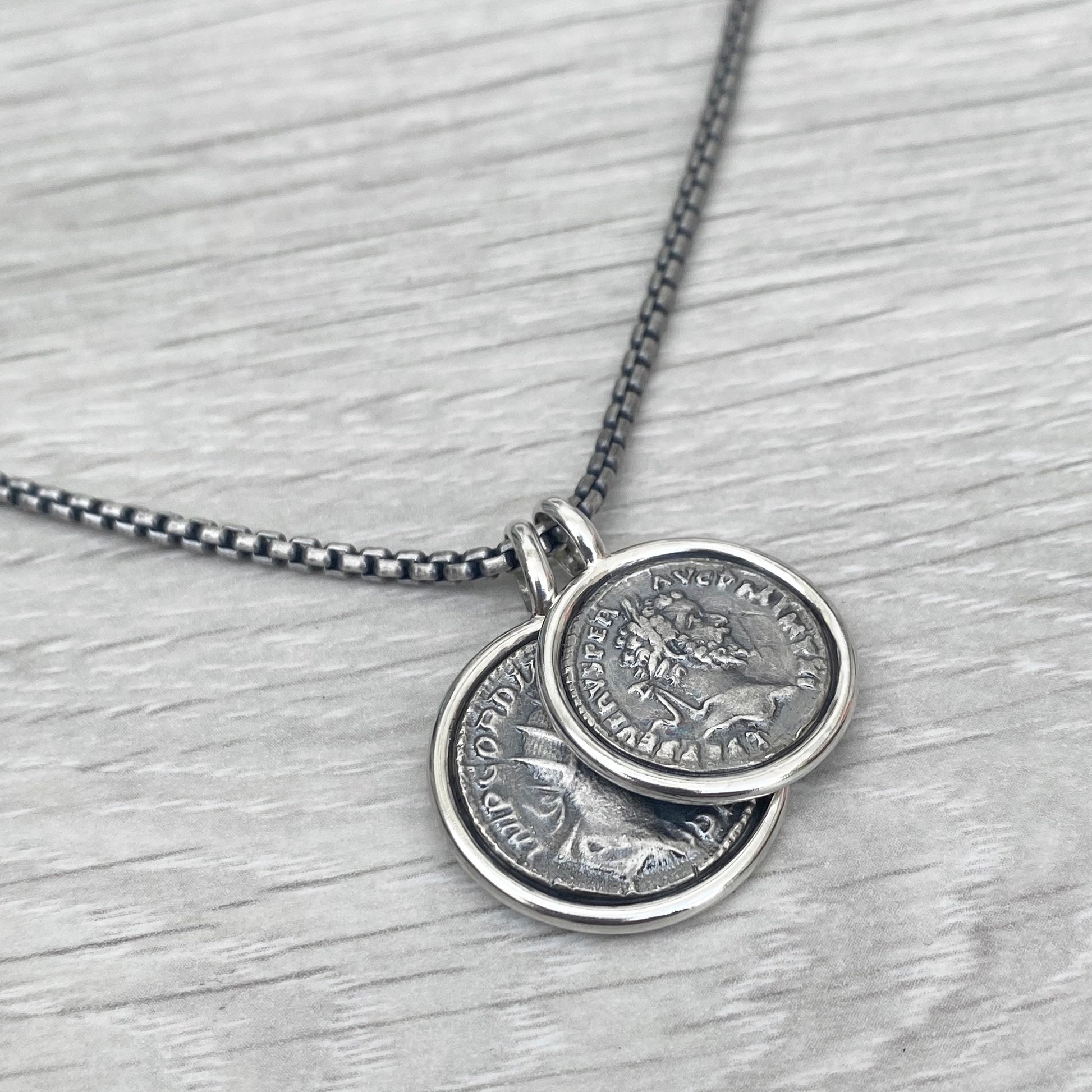 Oxidised solid Sterling silver replica Roman coin circle framed pendants on a choice of trace or round box chain